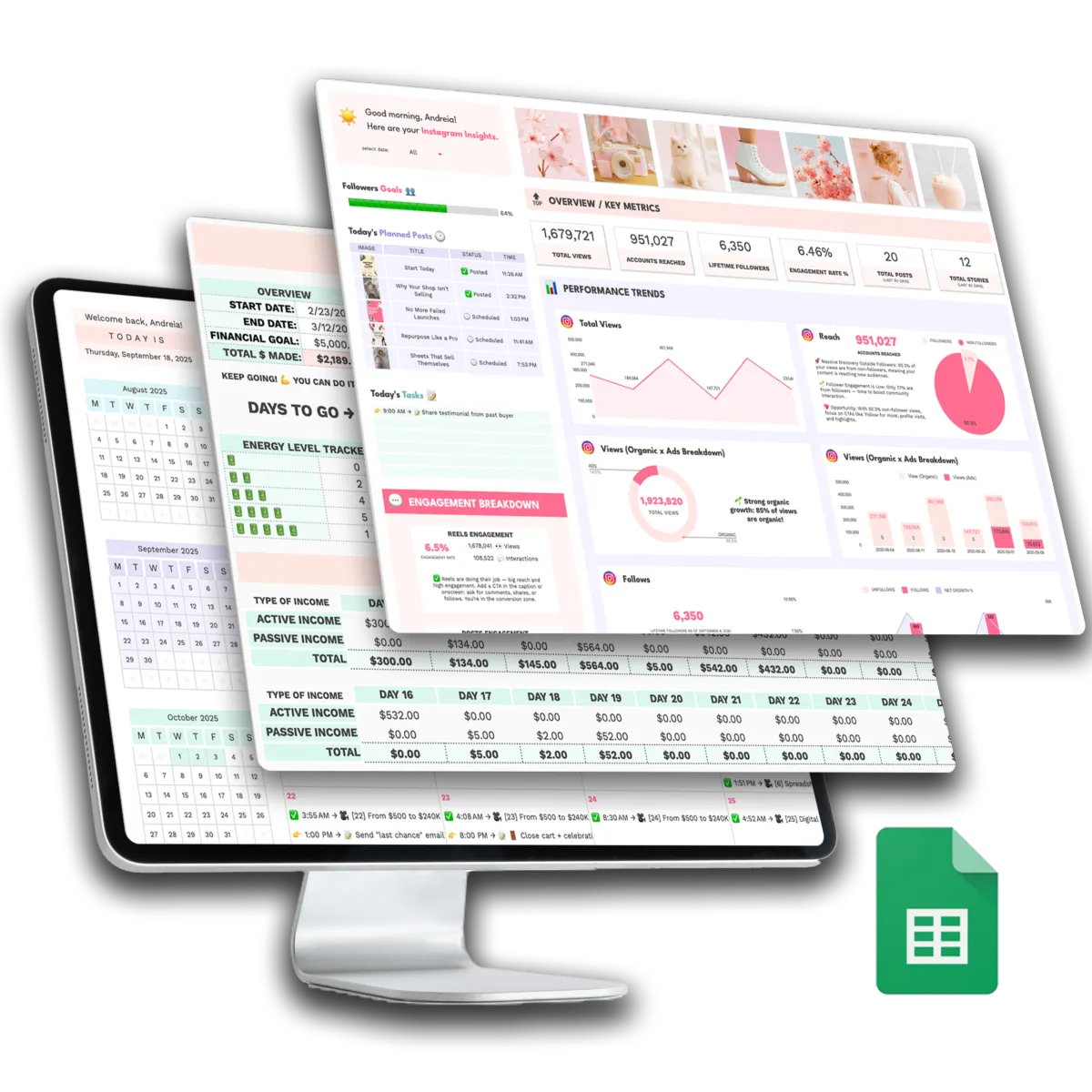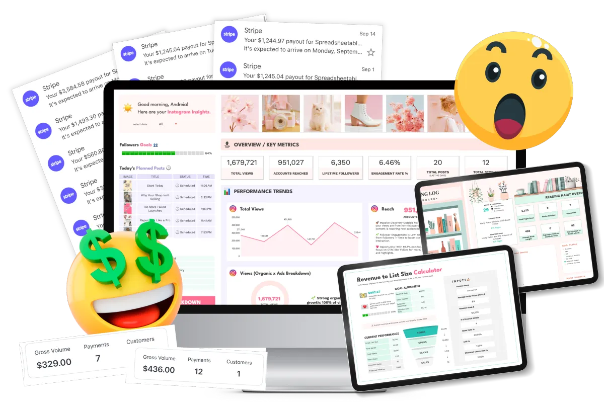 At Spreadsheetables™, our mission is simple: to equip you with the exact tools we’ve used to grow our business to consistent $14k months, so you can confidently organize and scale yours.
